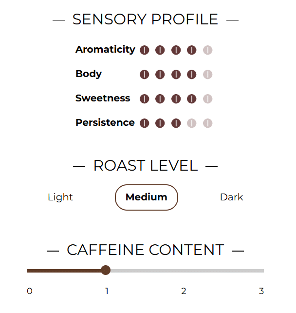 Kaffen har en fyldig og fløjlsblød krop, understøttet af en medium ristning, der fremhæver smagens vedholdenhed uden at være tung. Eftersmagen er lang med noter af mørk chokolade og tørret frugt.