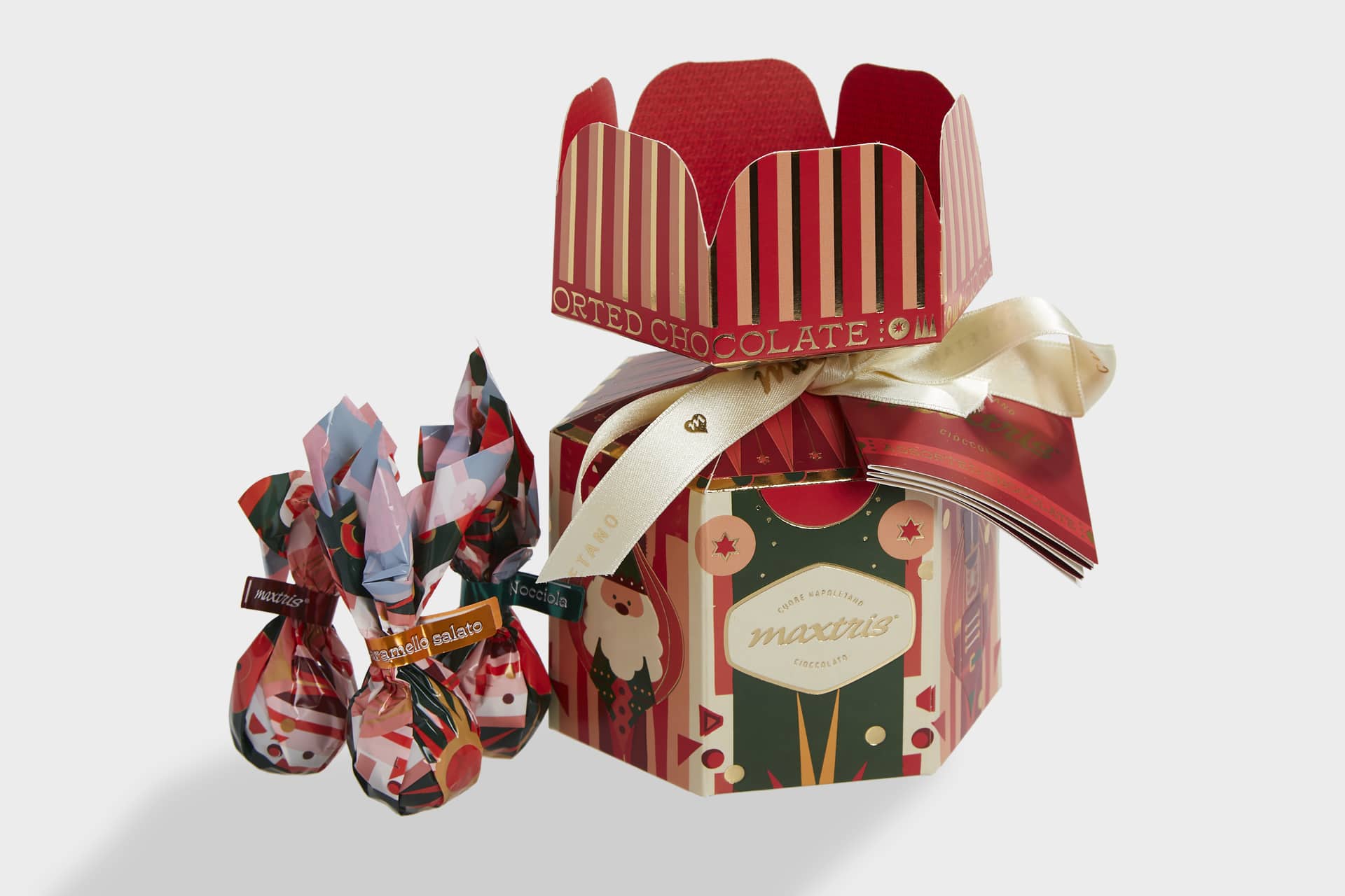 Praline af MÆLKEchokolade (kakao: min. 28%) og mørk chokolade (kakao: min. 50%) i assorterede smagsvarianter – GLUTENFRI Ingredienser: MÆLKEchokolade (33,3%) (sukker, SØDMÆLKSPULVER, kakaosmør, kakaomasse, emulgator: SOJAlecithin, naturlig vaniljesmag), mørk chokolade (16,7%) (sukker, kakaomasse, kakaosmør, emulgator: SOJAlecithin, naturlig vaniljesmag), chokoladefyld (16,7%) (chokolade 46% (kakaomasse, sukker, kakaopulver med lavt fedtindhold, dextrose, MÆLKEfedt, emulgator: SOJAlecithin, naturlig vaniljesmag), vegetabilsk fedt (kokos, palmekerne, palme) i varierende proportioner, sukker, SKUMMETMÆLKSPULVER), hvid chokoladefyld med HASSELNØDDER (15%) (hvid chokolade 33,5% (SØDMÆLKSPULVER, kakaosmør, VALLEPROTEINPULVER, SKUMMETMÆLKSPULVER, dextrose, emulgator: SOJAlecithin, naturlig vaniljesmag), vegetabilsk fedt (kokos, palmekerne, palme) i varierende proportioner, sukker, dextrose, SØDMÆLKSPULVER, HASSELNØDDEpasta (1,7%)), MÆLKEchokoladefyld med saltet karamel (14,9%) (MÆLKEchokolade 29,5% (kakaomasse, sukker, SØDMÆLKSPULVER, vegetabilsk fedt (kokos, palmekerne, palme) i varierende forhold, sukker, dextrose, SØDMÆLKSPULVER, VALLEPROTEINPULVER, SKUMMETMÆLKSPULVER, fedtfattigt kakao-pulver, brændt sukkermassekaramel (1,7%), salt, emulgator: SOJAlecithin, naturlig vaniljesmag).