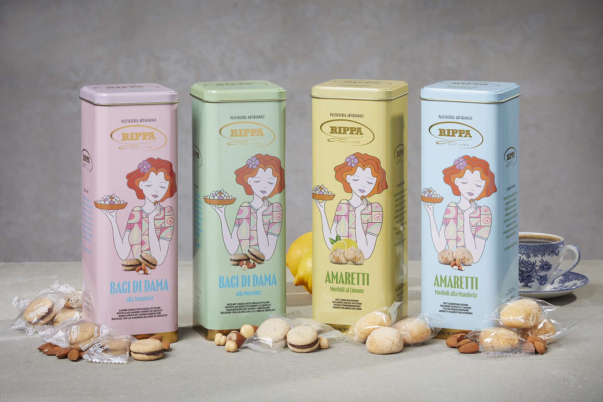 Serveret i flotte og anvendelige dåser (som i øvrigt også er perfekte til opbevaring af spaghetti), har vi Baci de Dama – en sandwich småkage i to varianter med chokoladefyld, samt Amaretti Morbid – en blød makron, ligeledes i to varianter.