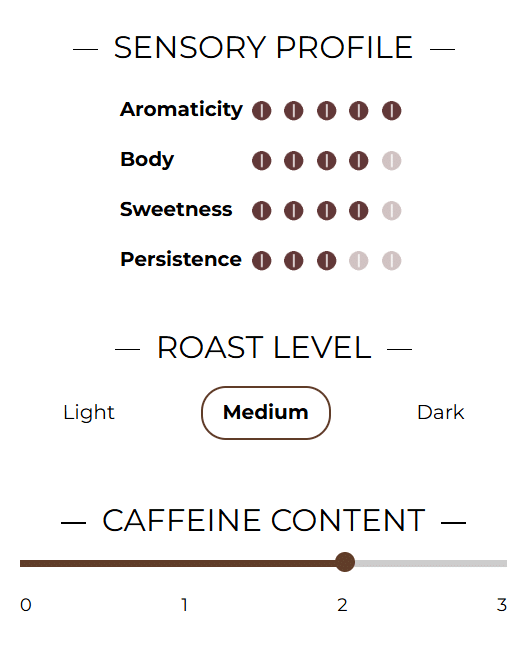 Mellemristningen, med den klassiske “munkekappe” nuance, bevarer blændingens delikatesse og fremhæver dens bløde og balancerede profil. Resultatet er en let, men smagfuld kaffe, perfekt for dem, der søger en raffineret og harmonisk oplevelse, uden at gå på kompromis med koppens vedholdenhed.